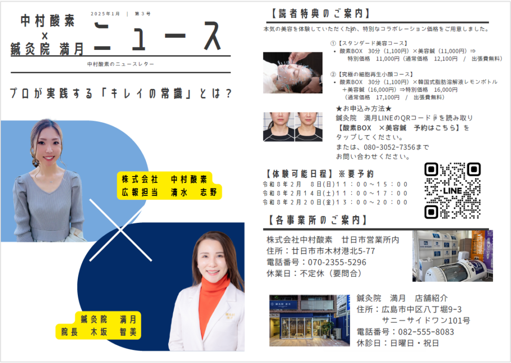 鍼灸と酸素BOXのそれぞれの効果効能や魅力をお届けします♪鍼灸院「満月」の木坂先生とのコラボ企画(#^.^#)☆ニュースレター第3弾です☆【体験可能日程】※要予約令和8年2月 8日(日)11:00~15:00令和8年2月14日(土)11:00~17:00令和8年2月20日(金)13:00~20:00ご予約やお問い合わせはお気軽にどうぞ♪